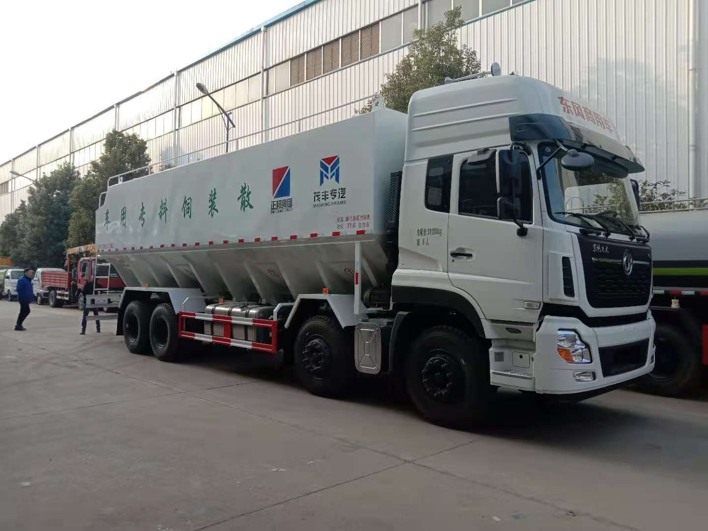 東風天龍前四后八高頂雙臥新款豪華駕駛室,康明斯6缸315馬力/雷諾350馬力發(fā)動機,法士特12檔變速箱,1850+4600+1350mm/2050+4400+1350mm軸距,11.00R20鋼絲胎,電動門窗,中控門鎖,原廠空調,ABS,方向助力,行車記錄儀,氣囊座椅,斷氣剎;上裝罐體容積約40立方,罐體采用4mm優(yōu)質碳鋼板制作,罐體內分為肆個倉,可獨立控制各分倉卸料順序和速度,整車3條蛟龍(底部水平絞龍、尾部垂直絞龍、頂部卸料絞龍),由3個5.5kw 380v電機帶動各絞龍工作,頂部絞龍液壓控制舉升,可左右旋轉180°,整車尺寸:12000×2500×3995mm