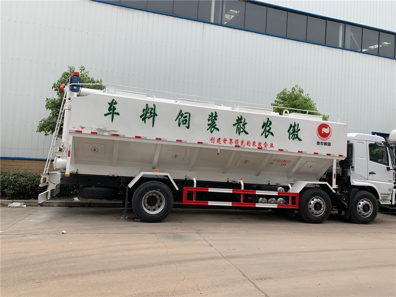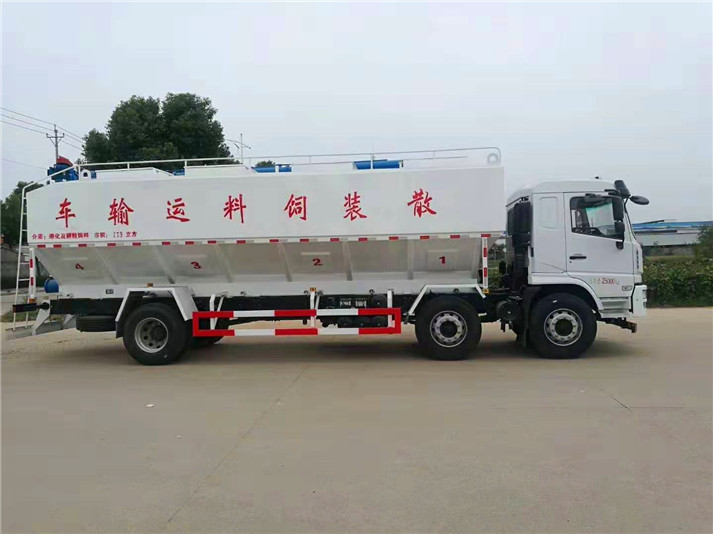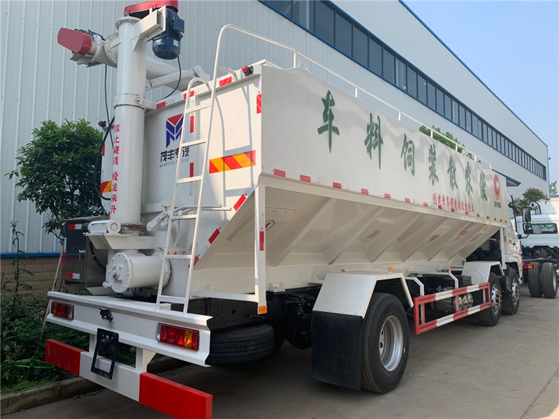 上裝罐體:罐體材質(zhì)采用4mm優(yōu)質(zhì)碳鋼板,整車3條絞龍,由3個(gè)5.5KW電機(jī)380V外接電源帶動(dòng),頂部絞龍用液壓控制舉升,可左右旋轉(zhuǎn)180°。罐體內(nèi)分為肆個(gè)倉,可以獨(dú)立控制各分倉卸料順序和速度。