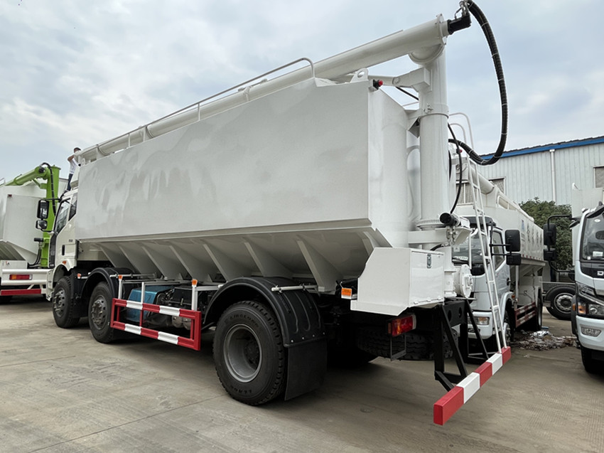 散裝飼料運輸車,散裝飼料車的飼料罐架設在卡車的底盤上,罐頂開有進料口.頂部的一根螺旋輸送卸料管(俗稱卸料絞龍)則可自由回轉和抬升,抬升的仰角可達60度。運輸時,頂部的螺旋管平臥在罐頂;卸料時則抬起,使管端的出料口與畜禽飼養(yǎng)場貯料罐頂部的進料門相接,駕駛室內裝有操縱裝置(操縱裝置也可裝置在罐體尾部),卸料時通過車底的動力輸出軸和減速器來驅動螺旋,以完成卸料。