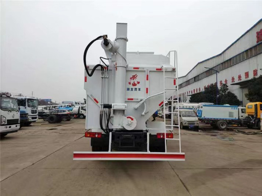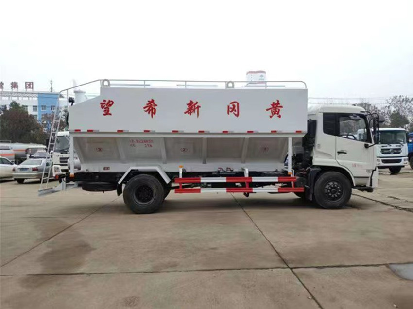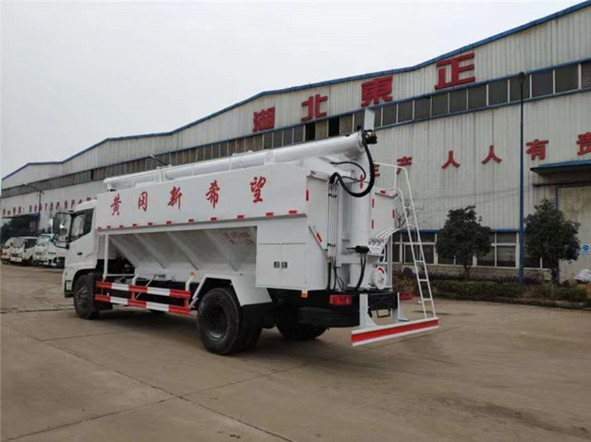 散裝飼料運(yùn)輸車,散裝飼料車的飼料罐架設(shè)在卡車的底盤上,罐頂開有進(jìn)料口.頂部的一根螺旋輸送卸料管(俗稱卸料絞龍)則可自由回轉(zhuǎn)和抬升,抬升的仰角可達(dá)60度。運(yùn)輸時(shí),頂部的螺旋管平臥在罐頂;卸料時(shí)則抬起,使管端的出料口與畜禽飼養(yǎng)場(chǎng)貯料罐頂部的進(jìn)料門相接,駕駛室內(nèi)裝有操縱裝置(操縱裝置也可裝置在罐體尾部),卸料時(shí)通過車底的動(dòng)力輸出軸和減速器來(lái)驅(qū)動(dòng)螺旋,以完成卸料。