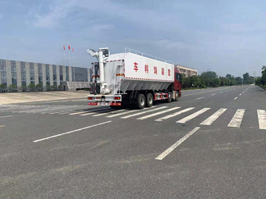 散裝飼料運(yùn)輸車(chē),散裝飼料車(chē)的飼料罐架設(shè)在卡車(chē)的底盤(pán)上,罐頂開(kāi)有進(jìn)料口.頂部的一根螺旋輸送卸料管(俗稱卸料絞龍)則可自由回轉(zhuǎn)和抬升,抬升的仰角可達(dá)60度。運(yùn)輸時(shí),頂部的螺旋管平臥在罐頂;卸料時(shí)則抬起,使管端的出料口與畜禽飼養(yǎng)場(chǎng)貯料罐頂部的進(jìn)料門(mén)相接,駕駛室內(nèi)裝有操縱裝置(操縱裝置也可裝置在罐體尾部),卸料時(shí)通過(guò)車(chē)底的動(dòng)力輸出軸和減速器來(lái)驅(qū)動(dòng)螺旋,以完成卸料。