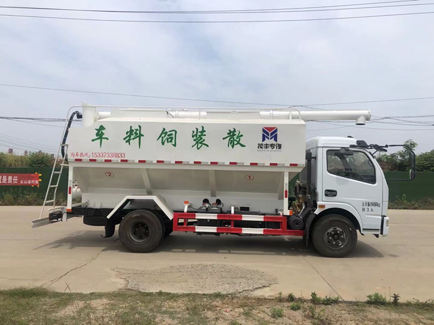 散裝飼料運(yùn)輸車(chē),散裝飼料車(chē)的飼料罐架設(shè)在卡車(chē)的底盤(pán)上,罐頂開(kāi)有進(jìn)料口.頂部的一根螺旋輸送卸料管(俗稱卸料絞龍)則可自由回轉(zhuǎn)和抬升,抬升的仰角可達(dá)60度。運(yùn)輸時(shí),頂部的螺旋管平臥在罐頂;卸料時(shí)則抬起,使管端的出料口與畜禽飼養(yǎng)場(chǎng)貯料罐頂部的進(jìn)料門(mén)相接,駕駛室內(nèi)裝有操縱裝置(操縱裝置也可裝置在罐體尾部),卸料時(shí)通過(guò)車(chē)底的動(dòng)力輸出軸和減速器來(lái)驅(qū)動(dòng)螺旋,以完成卸料。